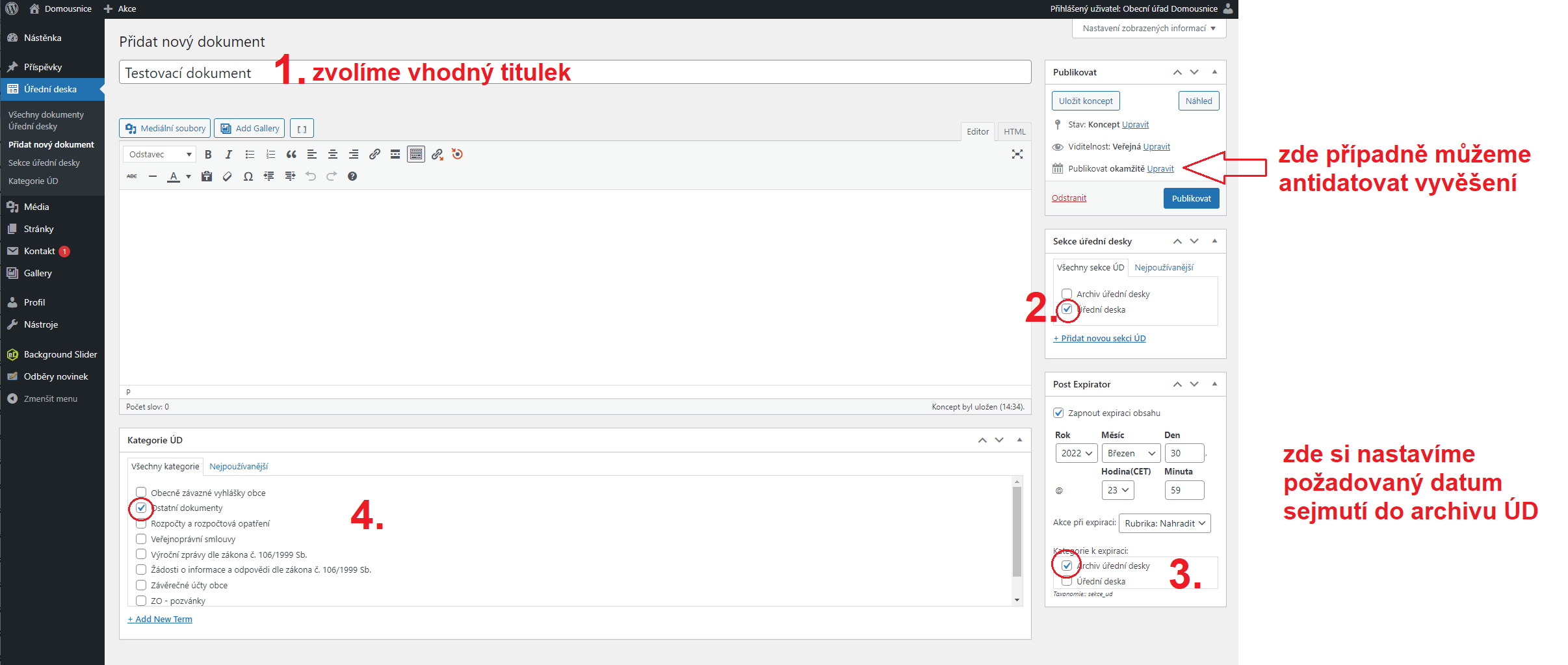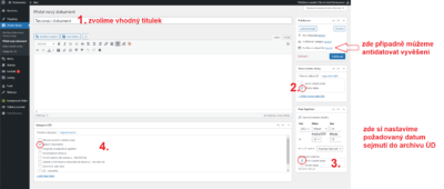 - Klikneme v editačním rozhraní v levém menu na „Úřední deska – Přidat nový dokument“ nebo to samé – kliknutím v horní liště na „+ Akce – Úřední deska“