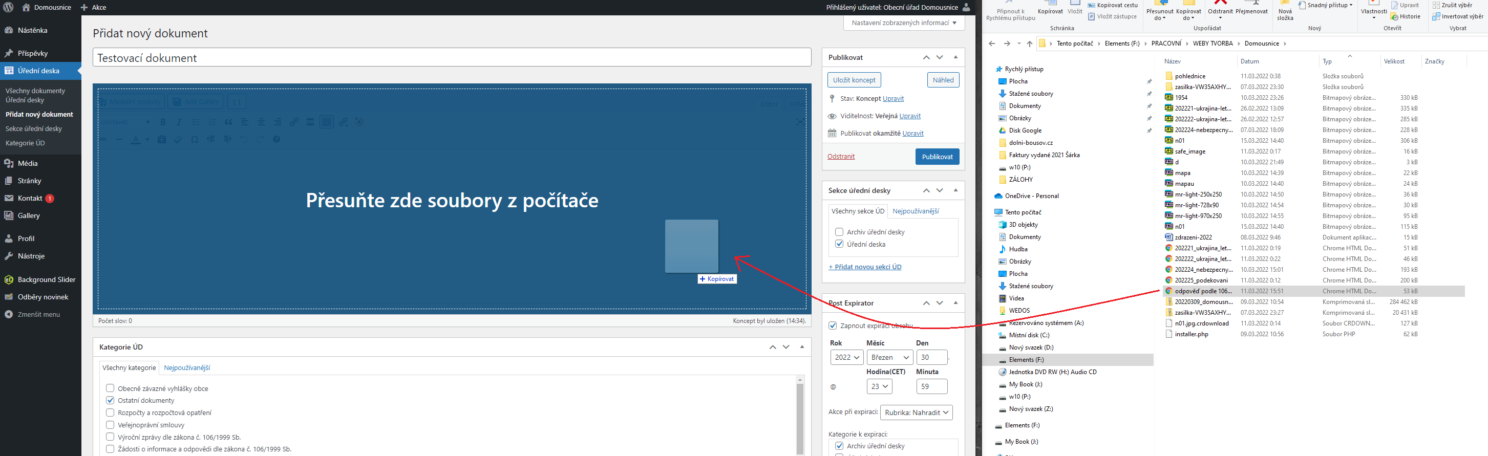 - Vložíme dokument přetažením myší (viz obrázek) případně kliknutím na tlačítko pod titulkem „Mediální soubory“. Souborů může být více, přílohy, dá se dopsat i text. Typy souboru nejsou limitované – ideálně Pdf (případně xls, doc).